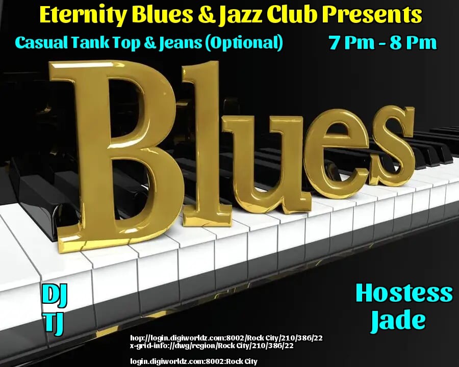 DJ TJ Mason And Hostess Jade Soraya at the Eternity Night Club - BLUES/JAZZ Venue!in 23 hours | 2025-12-10 19:00 SLT | Rock City | Added by Trynatie Mason*7-8PM OST Grid Time* - *Ready For Some Fun? Join Us! - THEME: Causal Tank Tops & Jeans - MUSIC: Blues/jazz - *GUARANTEED A GOOD TIME, CYA ON THE DANCE FLOOR!