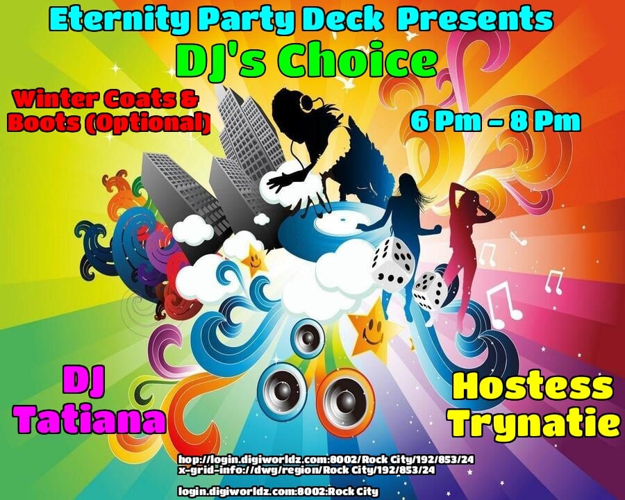 DJ Tatiana Volare and Hostess Trynatie Mason at the Eternity DECK Venue!in 1 days | 2025-12-30 18:00 SLT | Rock City | Added by Trynatie Mason6-8PM OST Grid Time - *Ready For Some Fun? Join Us! - THEME: Winter Coat & Boots - MUSIC: DJs Choice - RAFFLE: by Cosplay Gothic A Dark Moon Outfit, HG FRIENDLY! *GUARANTEED A GOOD TIME, CYA THERE!
