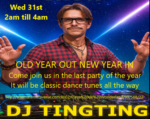 Last party of the year DJ Ting is playing classic dance track @ Club Wonderland Come dance the night away and enjoy some great tunes and good banter TAXI - hop://alternatemetaverse.com:8002/Playa%20de%20Wonderland/99/568/22 0 comments |