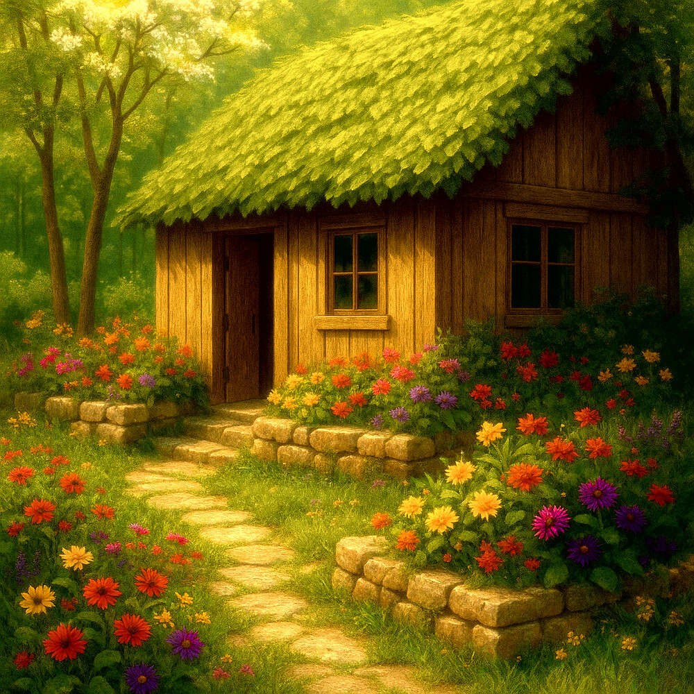 This image is an attempt to make Dimah and Djindjinah's house, using ChatGPT. It is nice, but not what I wanted: the big problem with drawing AI is that they do not follow the prompt. Here it stubbornly kept drawing the house from 3/4, with Disney elements, when I asked for an elven home seen from front. So this image will not be in the text.