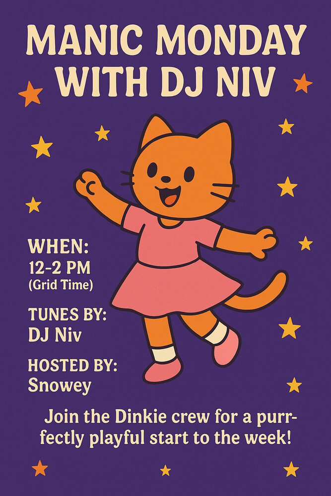 Theme: Come as you are — fun, friendly, and ready to groove! Join the Dinkie crew for a purr-fectly playful start to the week!