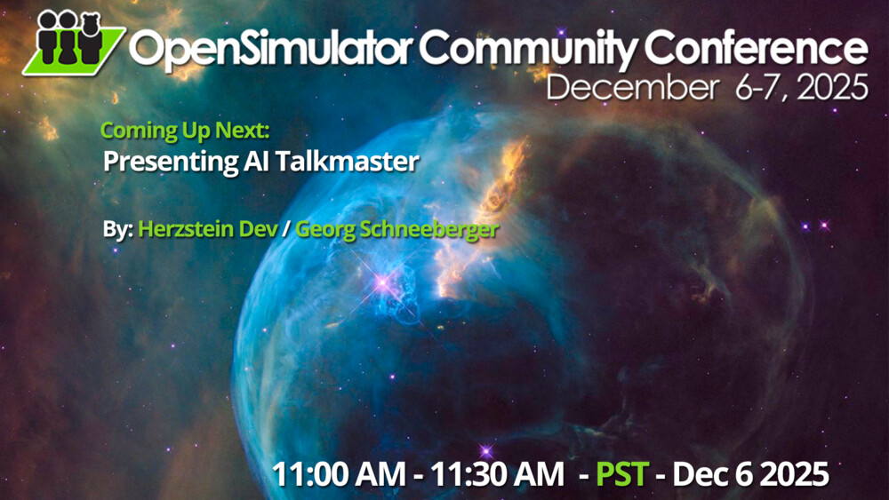 Introducing AI Talkmaster, a system for creating engaging conversations, debates, and theatre plays in OpenSimulator by using AI tools for personality capture and simulation of agents or AI bots in text and audio, in interaction with human actors or a human moderator.