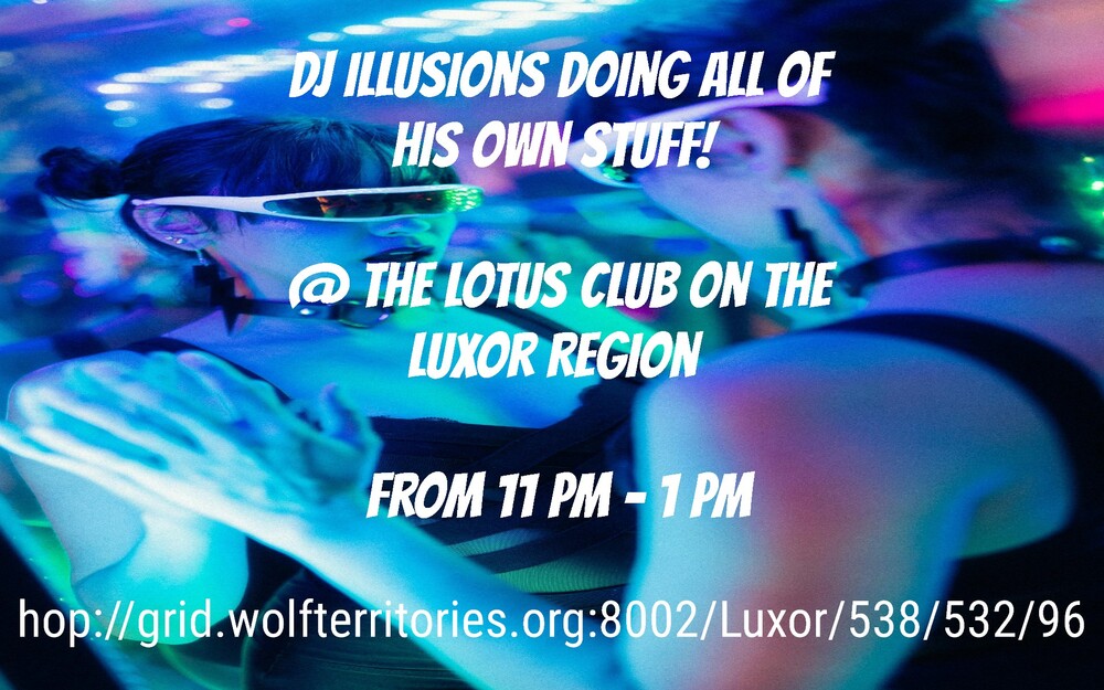 DJ Illusions Doing oll of his own stuff! @ The Lotus Club on the Luxor Region From 11 PM - 1 PM hop://grid.wolfterritories.org:8002/Luxor/538/532/96