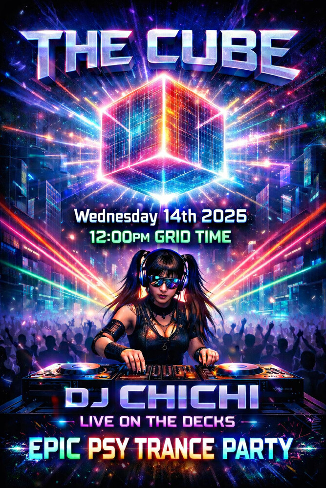 Yes, it's party time again at Cube!!! On Wednesday the 14th, 2026 at 12:00pm Grid Time, ChiChi will be blasting some Psy Trance tunes!!! Crazy, freaky, louder, harder, fun party people... YES, we can and do it better!!! So don't miss it and come to the Cube Dance Club!!!