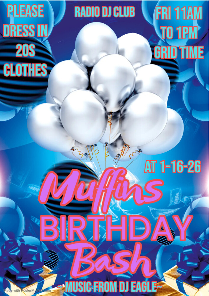 the great Gatsby Theamed and Muffins Birthday Party at 11am to 1pm Grid Time