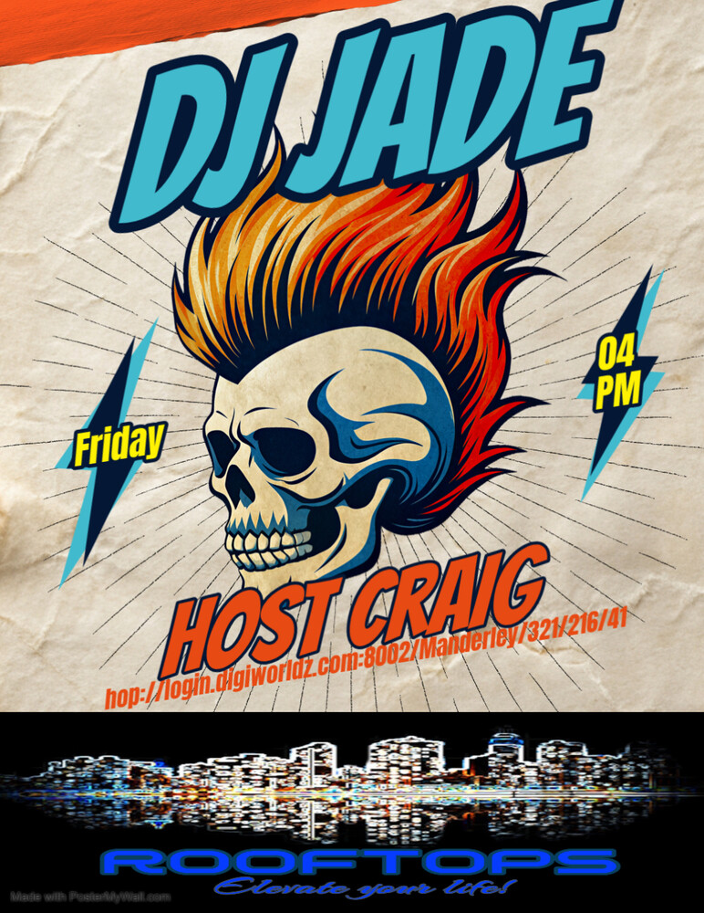 Filling in for sick Azora, Dj Jade and host Craig! One of the Best DJs on the grid and a not too sucky host, bring you the best in Rock and Roll at Rooftops! 4 - 6 pm. hop://login.digiworldz.com:8002/Manderley/321/216/41