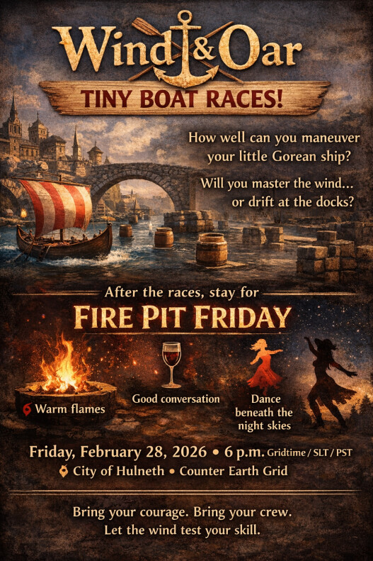 Join us for the Wind & Oar Little Ships Races and stay for Firepit Friday in Hulnuth - We hope to see you there. Land at the Sardar Fair and then IM Jarl Rath Thorson to get to the sim - jand.dyndns.biz:7002:GOR Sardar Fair