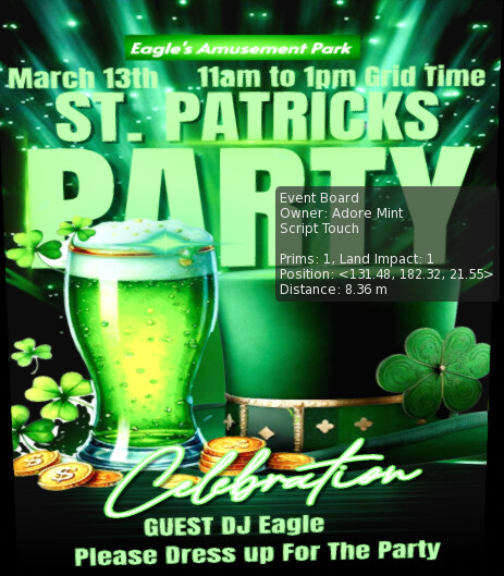 St Patty's Day Fun Join DJ Eagle at 11:00 grid time At DJ Eagles amusement park See you there dressing green and don't be mean