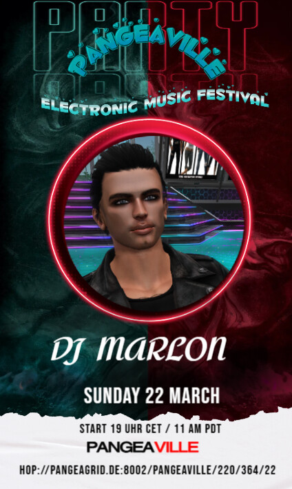 DJ Marlon Sunday 22 March Start: 19:00 CET / 11:00am PDT good mood , good tunes cool rhythms hop://pangeagrid.de:8002/PangeaVille/220/364/22