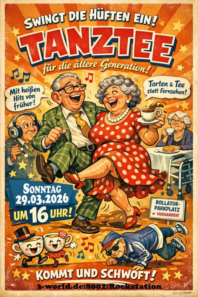 Einladung zum Tanztee ??Schwingt die Hüften und genießt einen fröhlichen Nachmittag mit Musik, Kaffee & Kuchen!? Sonntag, 29.03.2026? 16:00 Uhr Mit den besten Hits von früher und guter Gesellschaft – einfach vorbeikommen und mitmachen! Wir freuen uns auf euch – kommt und schwoft! ?3-world.de:8002:RockStation