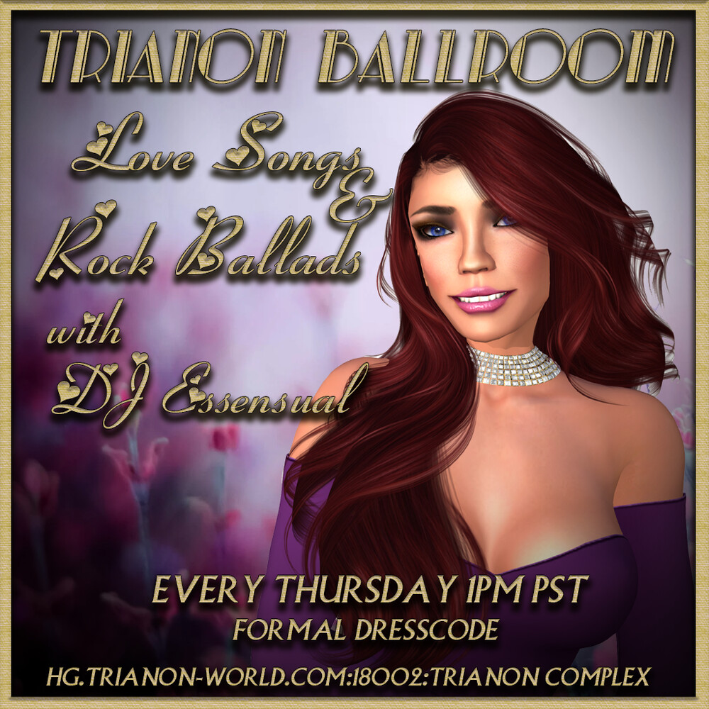 Do you love to dance to soft music, and chat with a group of friendly people or with your partner? If yes, then Trianon's Ballroom is the perfect place for you to be on Thursdays at 1:00 pm PST. The talented DJ Essensual will at 1pm playing the best love songs and your requests. Trianon offers a unique dance ball that provides a magical escape into another era, an experience found nowhere else. Dress code formal venue.