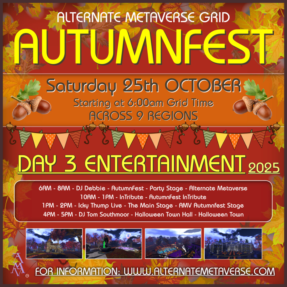 DJ Yana opening DJ at AutumnFest @ Party Stage~Alternate Metaversein 13 minutes | 2025-10-23 07:00 SLT | Alternate Metaverse | Added by Cataplexia Numbers✦Join us for an unforgettable session at the New Landing Point in Alternate Metaverse Grid!