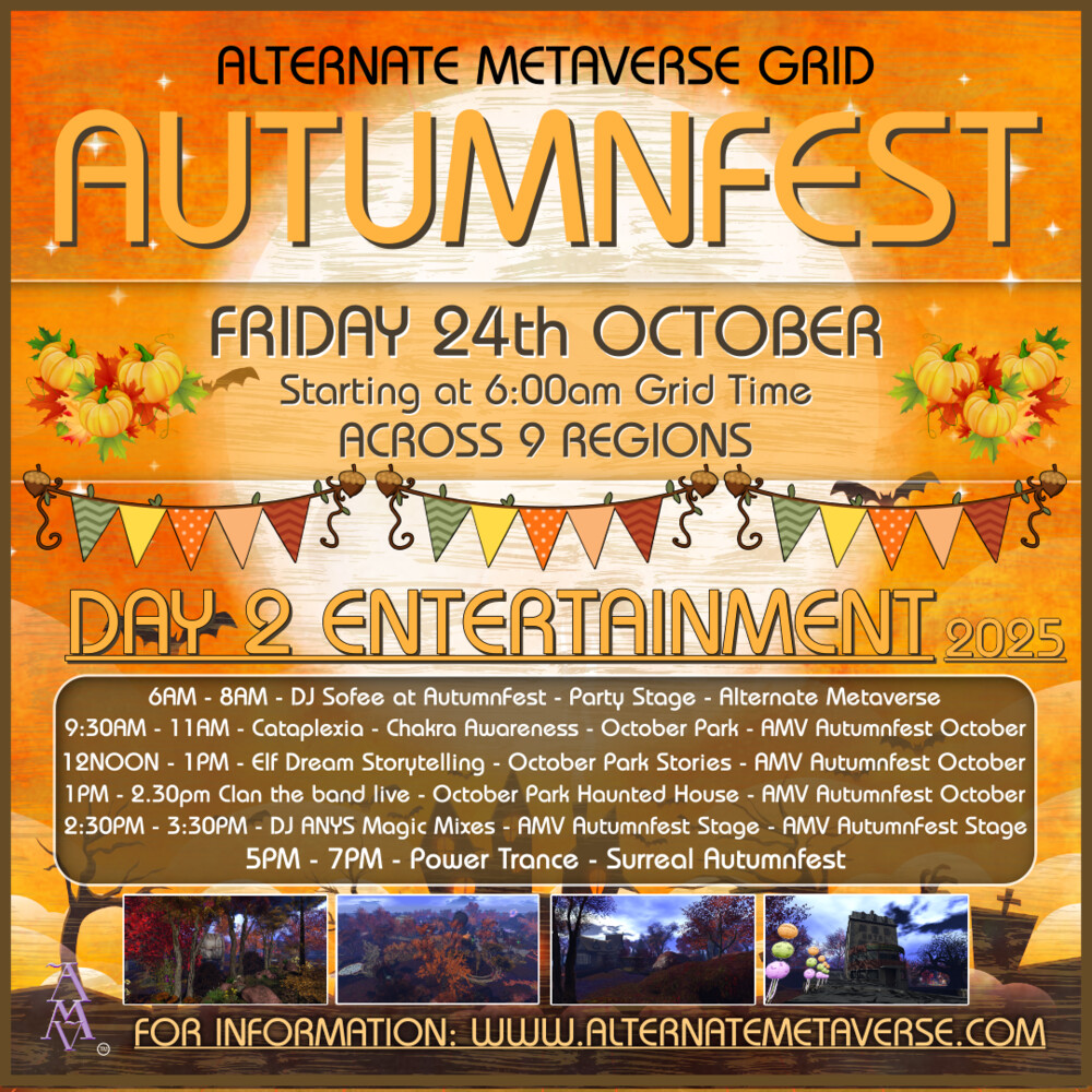 DJ Sofee AutunFest EARLY MORNING BREAKFAST SHOW@Alternate Metaverse Stage~Alternate Metaversein 1 days | 2025-10-24 07:00 SLT | Alternate Metaverse | Added by Cataplexia Numbers✦Join us for an unforgettable session at the New Landing Point in Alternate Metaverse Grid!