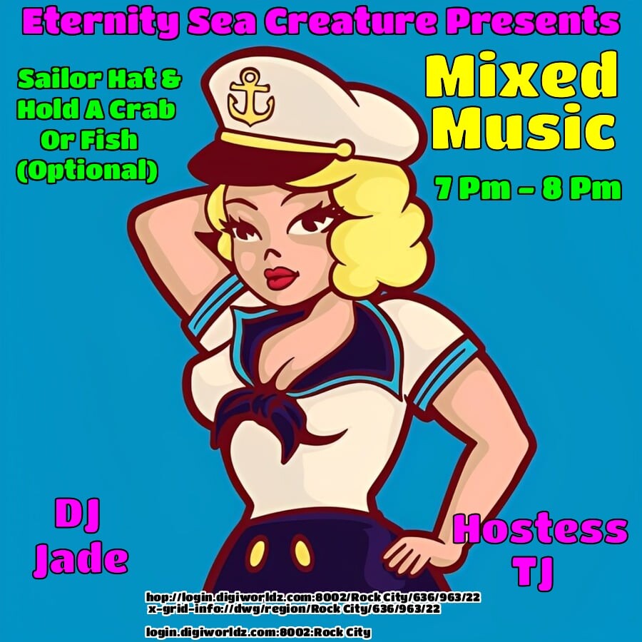 DJ Jade Soraya and Hostess TJ Mason at the Eternity Night Club - SEA CREATURE Venue!in 5 days | 2026-01-07 19:00 SLT | Rock City | Added by Trynatie Mason*7-8PM OST Grid Time* - Ready For Some Fun? - THEME: Sailor Hat & Hold or wear a Crab - MUSIC: Mixed - RAFFLE: By Cosplay Universe - HG Friendly! - GUARANTEED A GOOD TIME, CYA THERE!