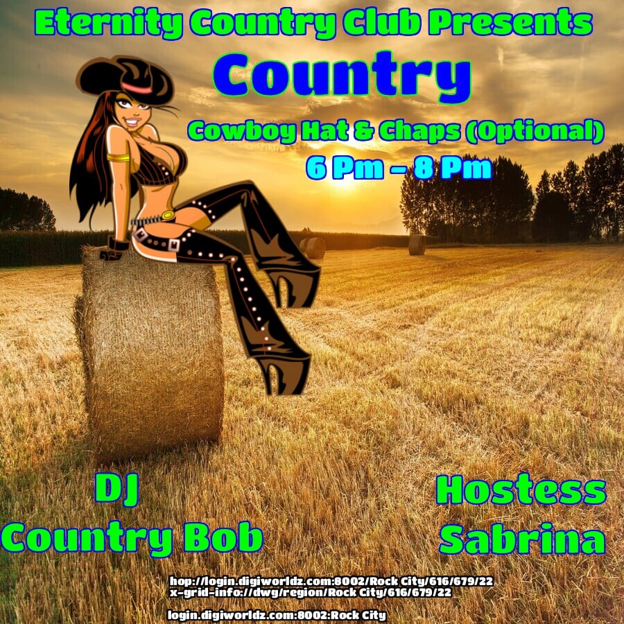 DJ Country Bob and Hostess Sabrina at the Eternity COUNTRY Venue!in 6 days | 2026-01-08 18:00 SLT | Rock City | Added by Trynatie Mason*6-8PM OST Grid Time! - Ready For Some Fun? Join Us! - THEME: Cowboy Hat & Chaps - Music: Country - Bull Rides For A Prize *GUARANTEED A GOOD TIME, CYA THERE!