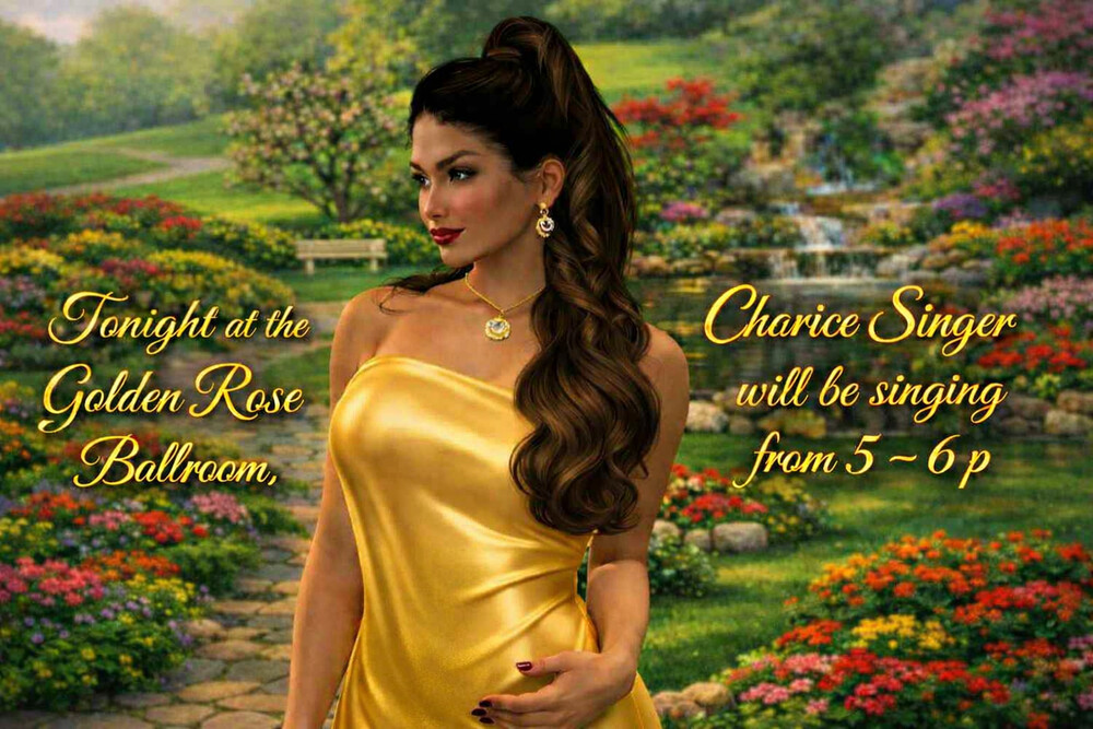 Cherice Singer will be singing at the Golden Rose Ballroom from 5-6pmin 9 days | 2026-04-11 17:00 SLT | All Graders Vets | Added by OwenlacourCome hear her beautiful Voice at the Elegant Golden Rose Ballroom. She has a song list of over 1000 songs So Dress in your formal or semi-formal outfits and bring your friends.