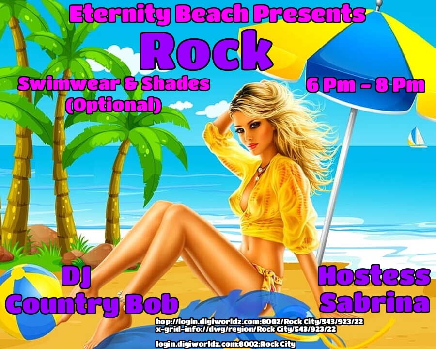 DJ Country Bob and Hostess Sabrina Dementros at Eternity BEACH Venue!in 4 days | 2026-04-06 18:00 SLT | Rock City | Added by Trynatie Mason*6-8PM OST GRID TIME* Ready For Some Fun? Join Us Tonight! - THEME: Swim Wear & Shades - MUSIC: Rock - GUARANTEED A GOOD TIME, CYA THERE!