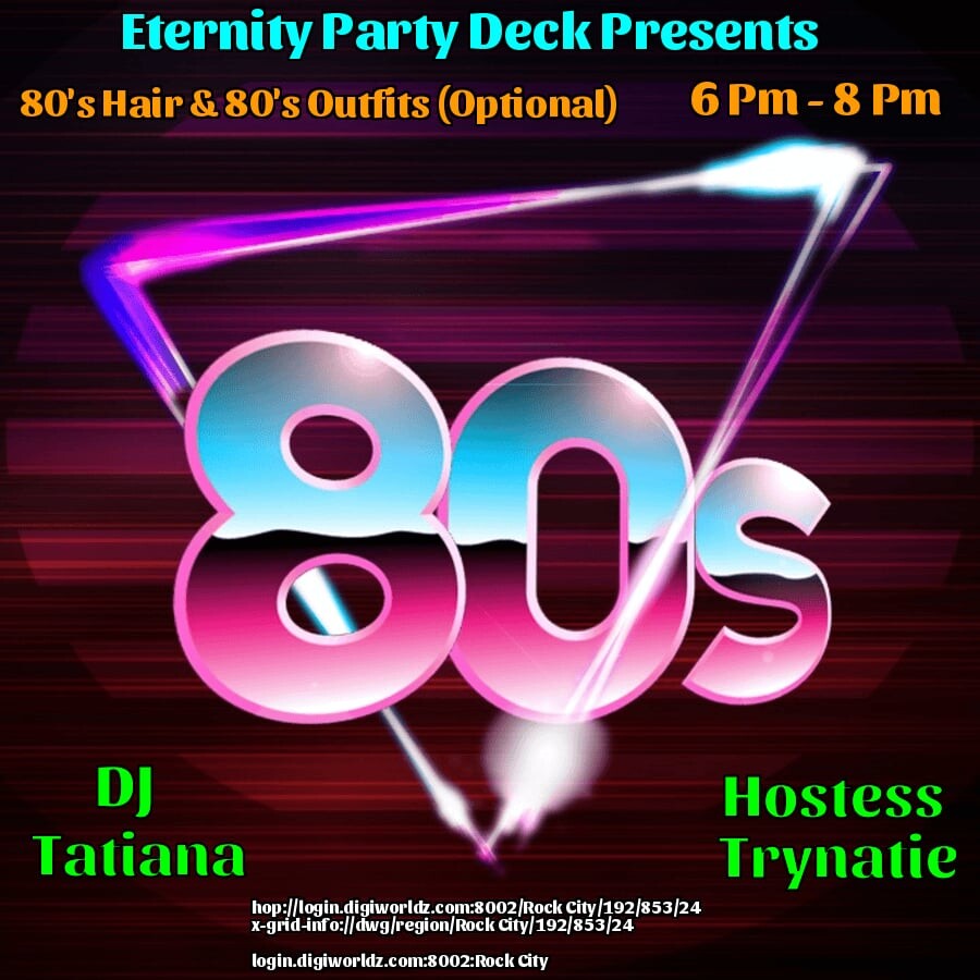 DJ Tatiana Volare and Hostess Trynatie Mason at the Eternity DECK Venue!in 5 days | 2026-04-07 18:00 SLT | Rock City | Added by Trynatie Mason6-8PM OST Grid Time - *Ready For Some Fun? Join Us! - THEME: 80s Hair & 80s Outfit - MUSIC: 80s - RAFFLE: by Cosplay Universe HG FRIENDLY! *GUARANTEED A GOOD TIME, CYA THERE!