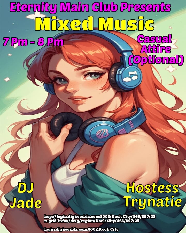 DJ Jade Soraya and Hostess Trynatie Mason at the Eternity Night Club - MAIN Venue!in 6 days | 2026-04-08 19:00 SLT | Rock City | Added by Trynatie Mason*7-8PM OST Grid Time* - Ready For Some Fun? - THEME: Casual Wear - MUSIC: Mixed - RAFFLE: By Frameworks - HG Friendly! - GUARANTEED A GOOD TIME, CYA THERE!