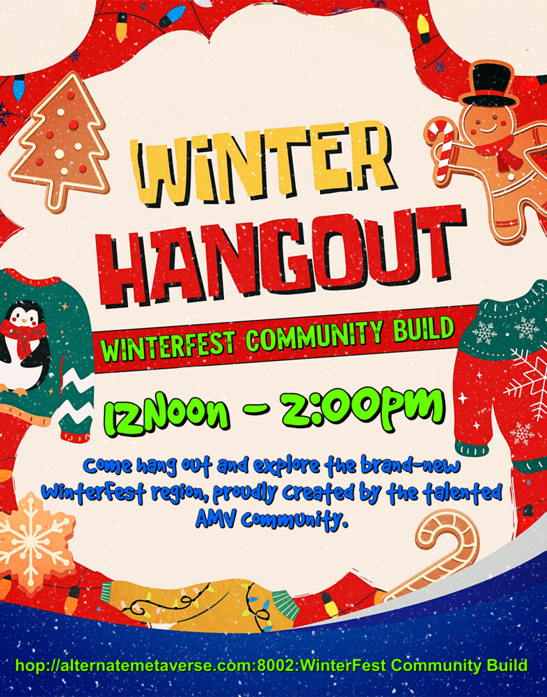 Winterfest social Winter Hangoutin 4 hours | 2025-12-24 12:00 SLT | WinterFest Community Build | Added by Cataplexia Numbers✦Winter Fun Hangout – a final gathering to bring everyone together as we wrap up all the fun, entertainment, and activities of AMV Winterfest.