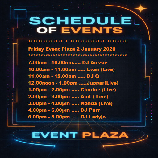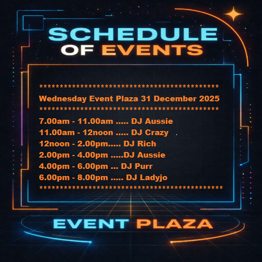 Thursday Event Plaza Osgrid35 minutes ago | 2026-01-01 07:00 SLT | Event Plaza | Added by OSgrid.org✦New Year's Day 2026 Live Singers & Dj's