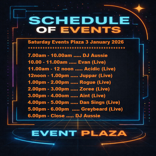 Saturday Event Plaza Osgridin 11 hours | 2026-01-03 08:00 SLT | Event Plaza | Added by OSgrid.org✦Live Singers & DJ's