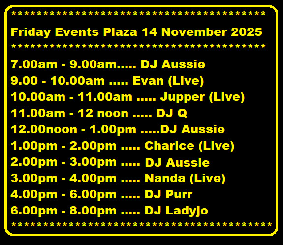 Friday Event Plaza Osgrid21 minutes ago | 2025-11-14 10:00 SLT | Event Plaza | Added by OSgrid.org✦Live Singers & DJ's
