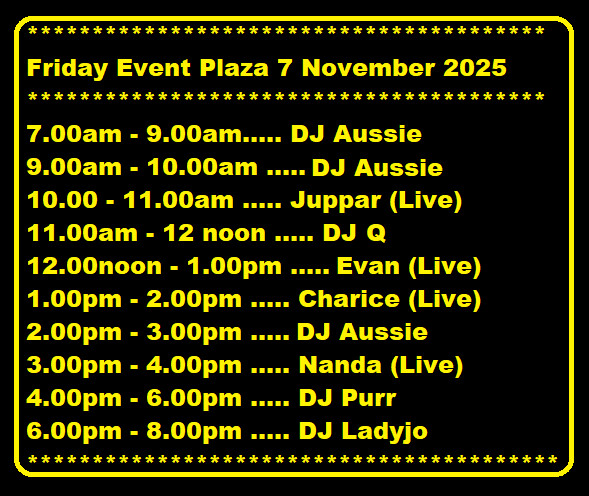 Friday Event Plaza Osgrid2 minutes ago | 2025-11-07 09:00 SLT | Event Plaza | Added by OSgrid.org✦Live Singers and DJ's