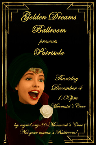 Putrisolo sings for the first time at the Golden Dreams ballroom 1:00pmin 6 hours | 2025-12-04 13:00 SLT | Mermaid's Cove | Added by Jojo Apple aka Harmony BeningborFor the very first time on the Golden Dreams Ballroom stage, experience the captivating voice of Putrisolo — a live singer whose performance will leave you spellbound! It's also the ballroom's first daytime event in open sim in hopes everyone everywhere can come and enjoy! Join us for an unforgettable afternoon of music beautiful music and fun! Don’t miss this debut appearance.... come and be part of the magic! Formal or dressy casual.