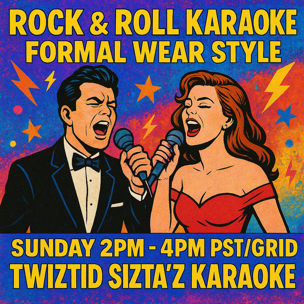 Rock & Roll Karaoke in Formal Wear Style @ Twiztid Sizta'z Shit Show Karaokein 1 days | 2025-10-12 14:00 SLT | Wicked Waves | Added by Faith Fromund✦This week all Rock & Roll! Songs must be songs rated PG. Other than that the sky is the limit. Sing on our house stream or on voice in local chat.