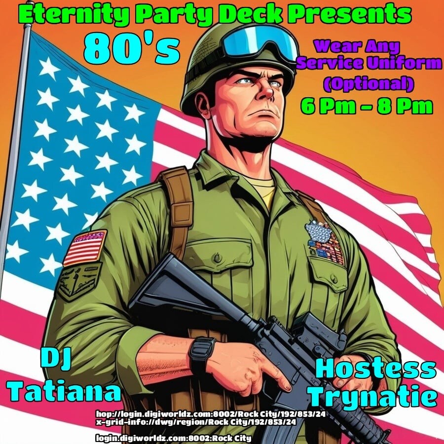 VETERANS DAY With DJ Tatiana Volare and Hostess Trynatie Mason at the Eternity DECK Venue!in 3 days | 2025-11-11 18:00 SLT | Rock City | Added by Trynatie Mason6-8PM OST Grid Time - *Ready For Some Fun? Join Us! - THEME: Wear Any Service Uniform - MUSIC: 80s - RAFFLE: by Cosplay Manga a Hatsuene Avatar (Artman Xue) - HG FRIENDLY! - *GUARANTEED A GOOD TIME, CYA THERE!