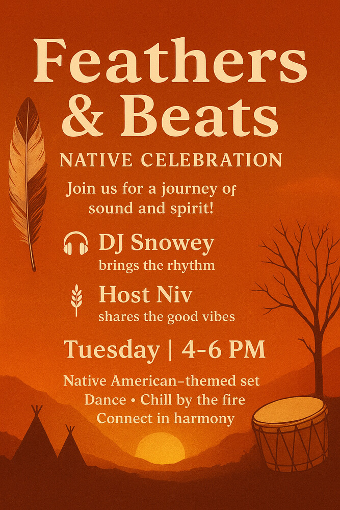 DJ Snowey brings the rhythm Host Niv welcomes you with good vibes Tuesday | 4–6 PM Native American–themed set • Dance • Chill by the fire • Connect in harmony (Dress Up optional) 0 comments |