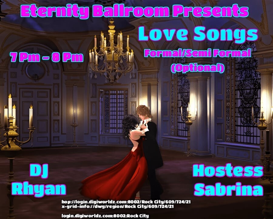 DJ Rhyan Creed and Hostess Sabrina Dementros at the Eternity BALLROOM Venue!Rock City 2 months ago | 2025-08-08 19:00 SLT *7-8PM OST Grid Time! - Ready For Some Fun? Join Us! - THEME: Formal/Semi Formal - MUSIC: Love Songs - *GUARANTEED A GOOD TIME, CYA THERE!