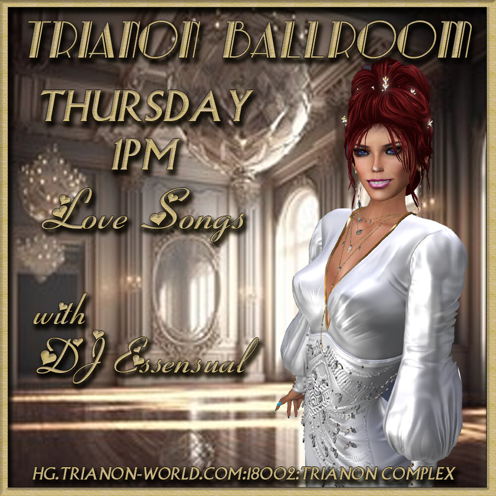 Let's turn the lights down low, and enjoy the music and company every Thursday at 1:00pm PT, when DJ Essensual plays some of the Best Love Songs and Rock Ballads and as always Your requests and Dedications at the Trianon's Ballroom. Come with your partner or enjoy dancing with one of the unique to Trianon NPC dancers. If you can use advanced lighting, and settings at Midnight or Sunset. This is a formal venue.