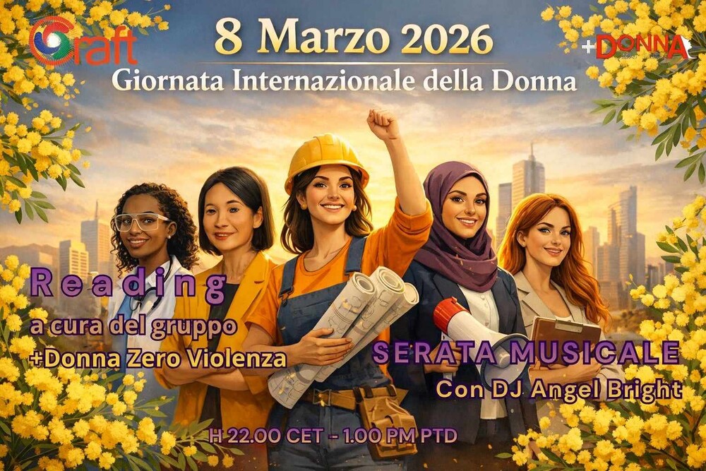 Più Donna Zero Violenza, presentation projectPiu Donna Zero Violenza 4 years ago | 2022-02-11 11:30 SLTFriday, February 11, 2022 at 21.30, will take place in the sim Più Donna ZeroViolenza in Craft World, the presentation of the project +Donna ZeroViolenza.