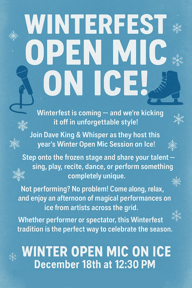 Winter Open Mic on IceChristmas Market in 5 days | 2025-12-18 13:30 SLTDave & Whisper - Winter Open Mic on Ice at the Open Mic Arts: Participate or enjoy creative performances on ice