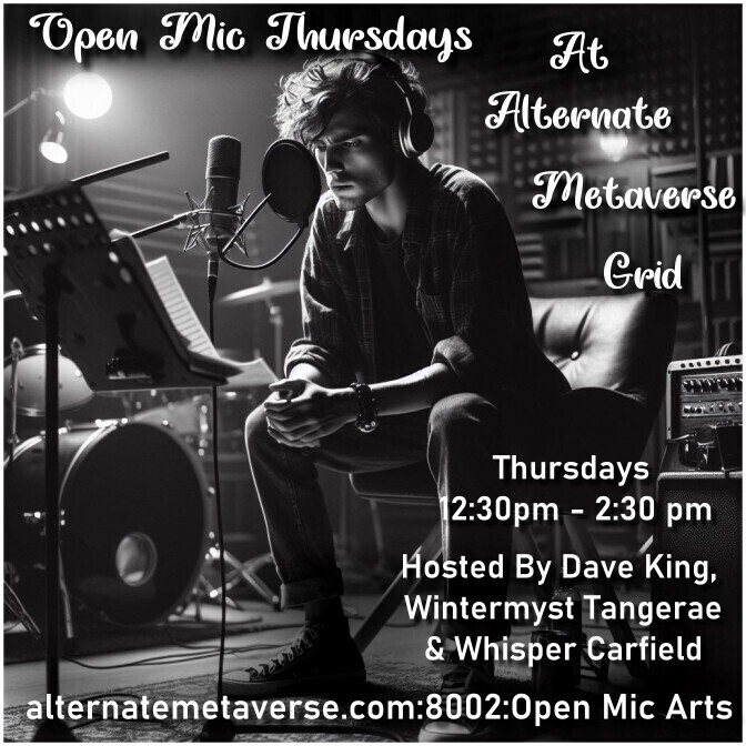 Open Mic Thursday@The Arts Club~Open Mic ArtsOpen Mic Arts in 1 days | 2025-12-04 12:30 SLTOpen Mic Thursdays! accepting talent by avatars throughout Alternate Metaverse & The OpenSim Hypergrid as well! Live Open Mic events are on Thursdays from 12:30-2:30pm, Hosted by Dave King, Wintermyst Tangerae & Whisper Carfield! We accept people in the order of which they sign up. Some of the talent will include:
