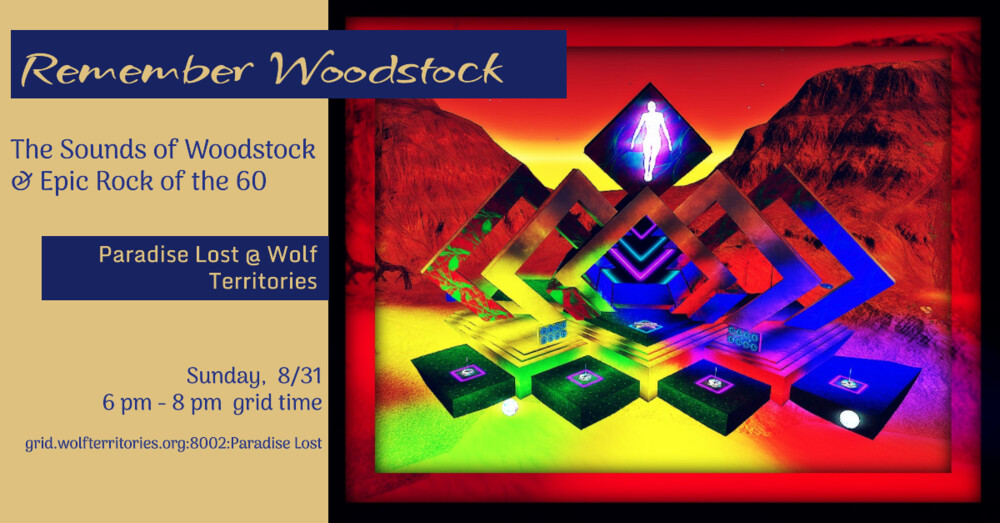 SUNDAY, AUGUST 31, 2025; 6 pm grid time grid.wolfterritories.org:8002/Paradise Lost - (*(*(*( TAKE NOTE OF LM! )*)*)*) DJ Xenon Darrow will guide you on this epic journey of music through the sounds of Woodstock and the epic rock of the late 60s and early 70s. 0 0 |