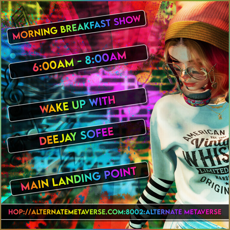 DJ SOFEE @ THE MORNING BREAKFAST SHOWAlternate Metaverse in 18 days | 2026-04-17 06:00 SLTJoin us for an unforgettable session at the New Landing Point in Alternate Metaverse Grid!