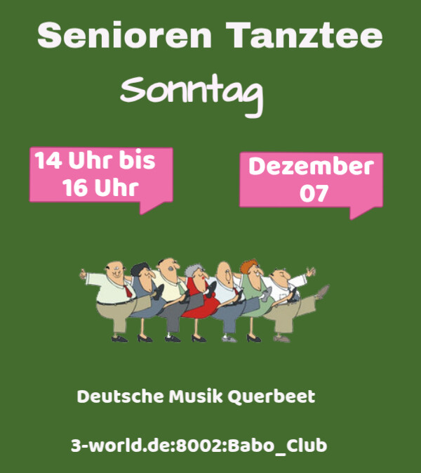 Am Sonntag, den 07.12.2025, heißt es wieder: Tanzen, Lachen und Genießen! Kommt vorbei in 3-World und verbringt einen wunderbaren Nachmittag voller Musik, Bewegung und guter Gesellschaft. Von 14 Uhr bis 16 Uhr. Wir freuen uns auf euch! 3-world.de:8002:Babo_Club 0 0 |