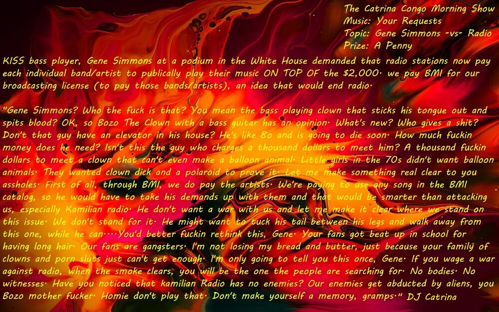 The Catrina Congo Morning ShowHempstein Island 11 hours ago | 2025-12-06 07:00 SLTMusic: Your Requests, Topic: Gene Simmons -vs- Radio