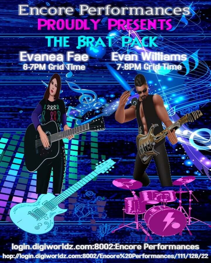 *DIGIWORLDZ* We’re thrilled to Announce Here at Encore Performances in Digiworldz, 2 live performances, singer's Evanea Fae & Evan Williams! **When: 6-7 PM OST Grid Time Evanea Fae & 7-8PM OST Grid Time Evan Williams! **Where: Encore Performances - DIGIWORLDZ Come and enjoy an unforgettable evening of music. Don’t miss out on these incredible performances! Looking forward to seeing you there! hop://login.d 0 1 |